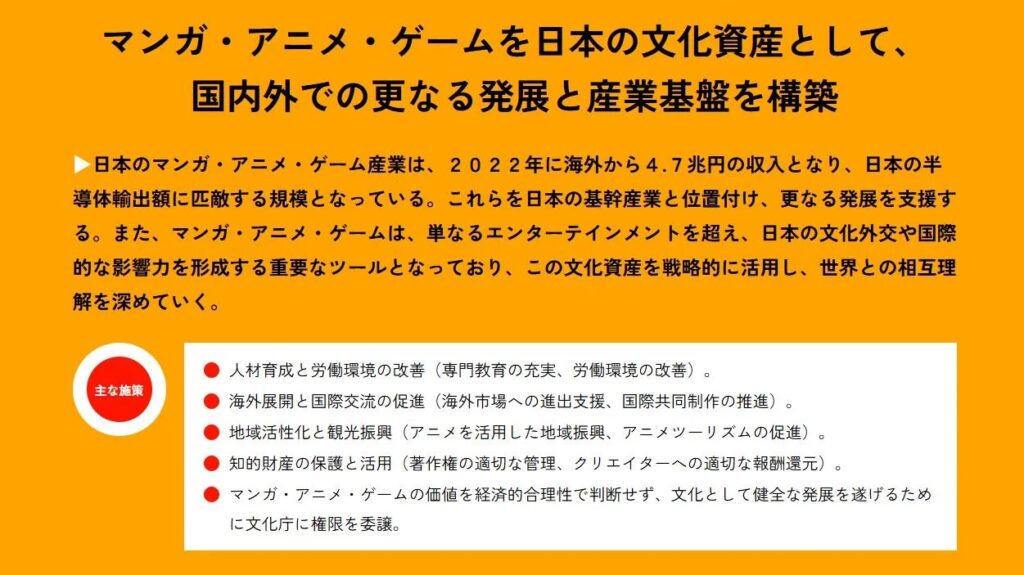 พรรคประกาศว่าจะสนับสนุนการเติบโตของอุตสาหกรรมเหล่านี้ผ่านมาตรการต่าง ๆ เช่น การส่งเสริมการศึกษาและพัฒนาบุคลากรในสายงาน การปรับปรุงสภาพการทำงานของผู้สร้างสรรค์ และการสนับสนุนธุรกิจในการเข้าสู่ตลาดโลก ซึ่งมีลักษณะคล้ายกับนโยบาย “Cool Japan” ของภาครัฐที่ผ่านมา