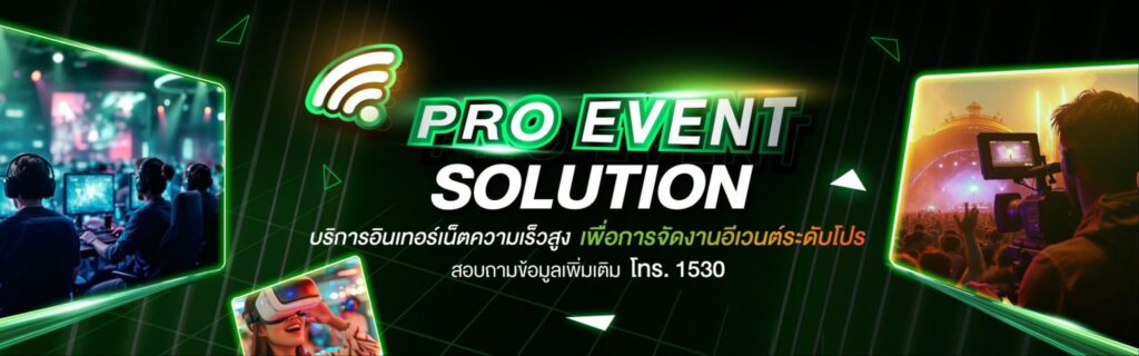 PRO-EVENT SOLUTION เหมาะสำหรับผู้จัดงานอีเวนต์มืออาชีพทุกประเภท ไม่ว่าจะเป็น Live Stream, Conference, Concert, E-Sport Tournament, งานแสดงสินค้า ไปจนถึงเทศกาลขนาดใหญ่ พร้อมทีมวิศวกรผู้เชี่ยวชาญที่ดูแลครบวงจร ตั้งแต่การออกแบบโครงข่าย การติดตั้ง จนถึงการดูแลหน้างานตลอดการจัดงาน เพื่อให้ทุกกิจกรรมเดินหน้าได้อย่างไร้สะดุด