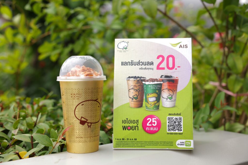 - ส่วนลดเครื่องดื่มเมนูที่ร่วมรายการ 20 บาท สำหรับลูกค้า AIS แลก AIS Points 25 คะแนน ที่ ร้าน KAMU Tea 167 สาขาทั่วประเทศ