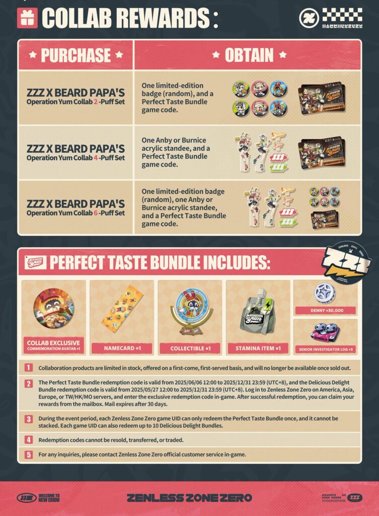 HoYoVerse เปิดตัวแคมเปญครอสโอเวอร์ระหว่าง Zenless Zone Zero กับร้านขนมชื่อดัง Beard Papa โดยจะจัดขึ้นในสหรัฐอเมริกาตั้งแต่วันที่ 8 มิถุนายน ถึง 15 กรกฎาคม 2025 พร้อมของสะสมสุดพิเศษและ Perfect Taste Bundle โค้ดไอเทมสำหรับใช้ในเกม