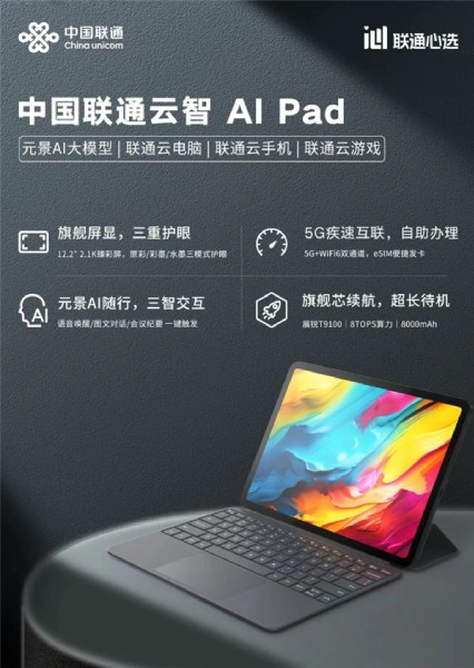 China Unicom วางจำหน่าย Cloud AI Pad พร้อม RAM 6GB และพื้นที่เก็บข้อมูล 128GB แบตเตอรี่ขนาด 8,000 mAh รองรับการชาร์จแบบมีสายกำลังไฟ 18W และระบุว่าสามารถใช้งานเล่นวิดีโอต่อเนื่องได้นานสูงสุดราว 10 ชั่วโมง
