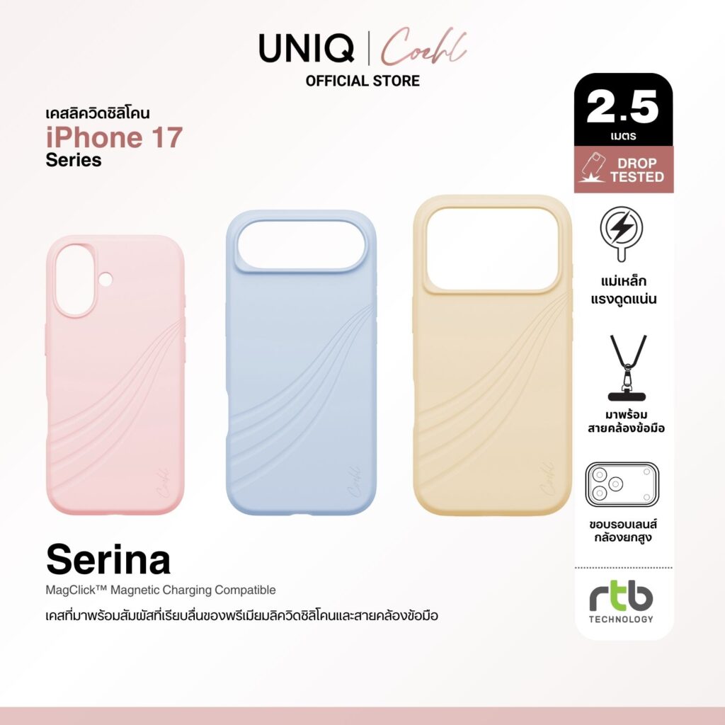 Serina เคสที่โดดเด่นด้วยดีไซน์มินิมอล พร้อมเส้นโค้งที่พลิ้วไหวอย่างอ่อนช้อยเสมือนการบรรจบกันของท้องฟ้า สายลม และผืนทราย ผลิตจากพรีเมียมลิควิดซิลิโคน ให้สัมผัสนุ่ม ลื่นมือ พร้อมเทคโนโลยีเคลือบผิว ช่วยลดการดูดซับฝุ่นและป้องกันรอยนิ้วมือได้อย่างมีประสิทธิภาพ ด้านในบุด้วยไมโครไฟเบอร์เนื้อนุ่มเพื่อรองรับแรงกระแทกและป้องกันรอยขีดข่วน โครงสร้างเคสแบบไฮบริดที่ผสานขอบยืดหยุ่นกับแผ่นหลังแข็งมอบการปกป้องรอบด้านแบบ 360 องศา รองรับการชาร์จแบบแม่เหล็กไร้สายด้วยวงแหวน MagClick™ สามารถรองรับแรงกระแทกจากการตกจากที่สูงได้ถึง 8 ฟุต (2.5 ม.)  มาพร้อมสายคล้องข้อมือที่ผลิตจากเชือกถักเนื้อนุ่ม น้ำหนักเบา ทนทาน วางจำหน่ายในราคา 1,290 บาท