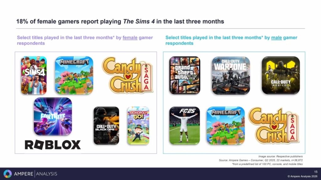 ตัวอย่างเช่น ในช่วงสามเดือนที่ผ่านมา 18% ของผู้เล่นหญิงที่ถูกสำรวจระบุว่าเล่น The Sims 4 ซึ่งสะท้อนถึงความนิยมของเกมแนวจำลองชีวิตและเกมที่ให้ผู้เล่นสร้างเรื่องราวของตัวเอง