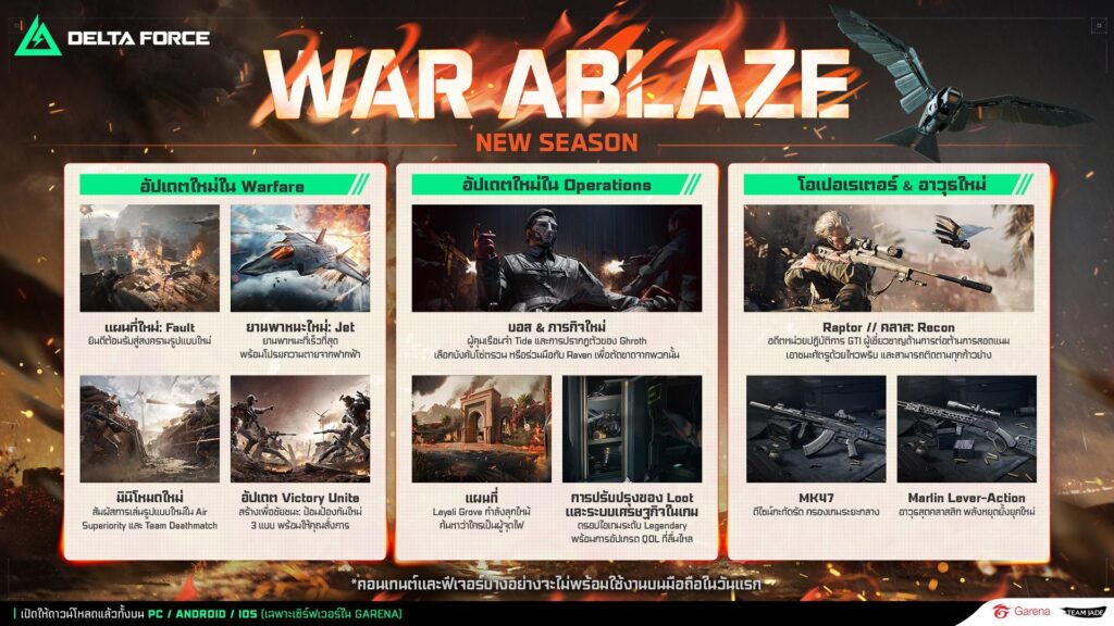 Garena® Delta Force เปิดตัวซีซันใหม่ War Ablaze มาพร้อมกับการอัปเดตเกมเพลย์และแผนที่ครั้งใหญ่ทั้งในโหมด Warfare และ Operations นอกจากนี้ผู้เล่นจะได้พบกับกิจกรรมความร่วมมือสุดยิ่งใหญ่ทั้งจาก SAW จากค่าย Lionsgate’s ตั้งแต่วันนี้ จนถึงวันที่ 21 พ.ย. และเตรียมพบกับแคมเปญสุดยิ่งใหญ่กับ METAL GEAR SOLID Δ: SNAKE EATER จากค่าย Konami Digital Entertainment (KONAMI)