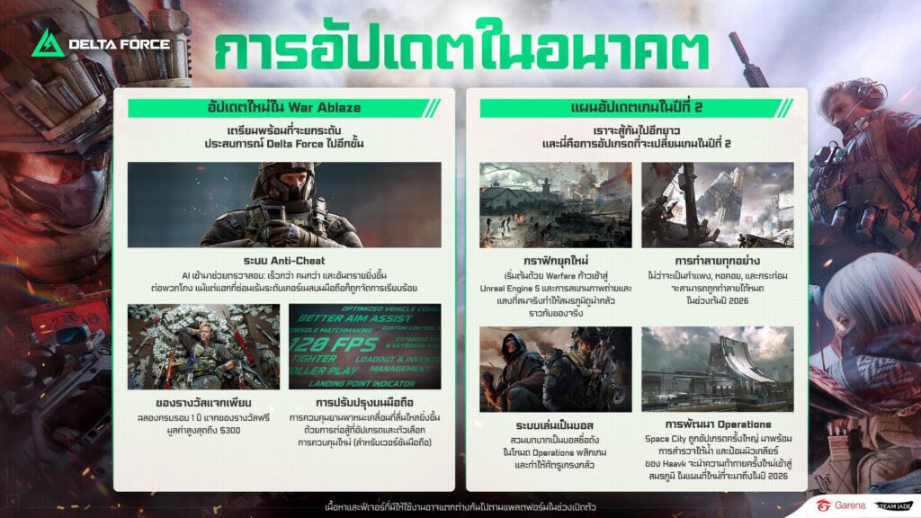 - การอัปเดต Engine & Visual: Garena® Delta Force จะย้ายไปใช้ Unreal Engine 5 พร้อมผสานเทคโนโลยี Photogrammetry และระบบแสงแบบเรียลไทม์ เพื่อสร้างสภาพแวดล้อมสมรภูมิที่สมจริงยิ่งขึ้น