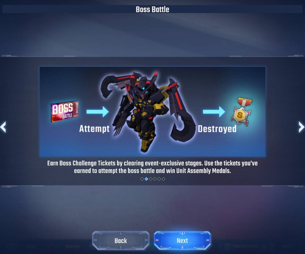 • รับตั๋ว Boss Challenge Tickets จากการเคลียร์ด่าน แล้วใช้ตั๋วต่อสู้กับบอสเพื่อรับ Unit Assembly Medals