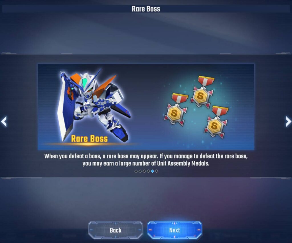 • เมื่อกำจัดบอสสำเร็จ มีโอกาสพบ Rare Boss ซึ่งให้รางวัล Unit Assembly Medals จำนวนมาก