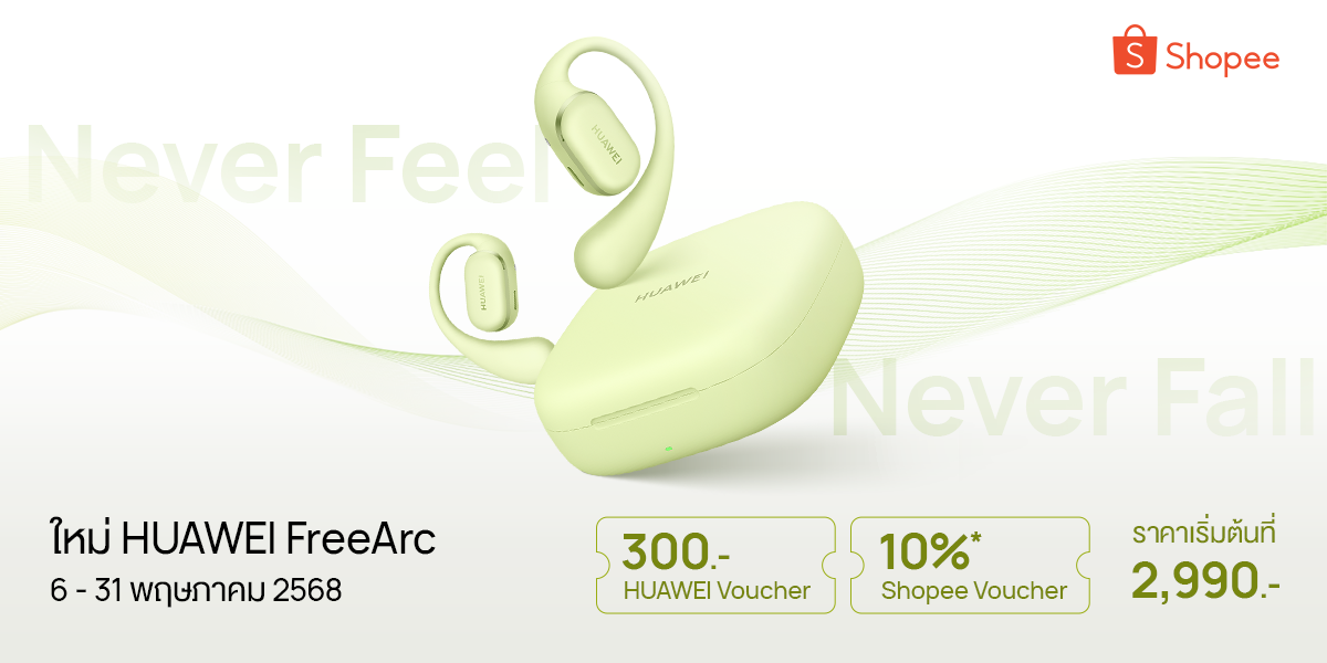 หลังจากกระแส HUAWEI FreeArc แรงไม่หยุดในวันโปร Shopee 5.5 ล่าสุดหัวเว่ยต่อโปรใหญ่! เดินหน้าขยายดีลพิเศษอย่างต่อเนื่อง สำหรับใครที่พลาดดีลวันเดียวไม่ต้องเสียดาย เพราะตอนนี้คุณสามารถเป็นเจ้าของ HUAWEI FreeArc หูฟังไร้สายรุ่นใหม่ ในราคาสุดคุ้ม เริ่มต้นเพียง 2,990 บาท พร้อมโปร ลด 2 ต่อ ยาวถึง 31 พฤษภาคม 2568 ที่ Shopee เพียงใส่โค้ด HUAWEBFAR รับส่วนลดเพิ่มทันที 300 บาท จากหัวเว่ย อย่าลืมเก็บโค้ดส่วนลด Shopee ลดเพิ่มอีก 10% ทันที (ตามเงื่อนไข)