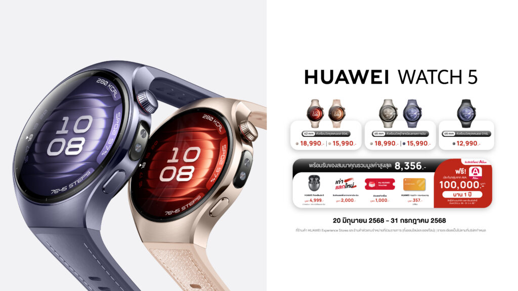 พร้อมข้อเสนอรับของสมนาคุณรวมมูลค่าสูงสุด 8,356 บาท ตั้งแต่วันที่ 20 มิถุนายน 2568 – 31 กรกฏาคม 2568 ประกอบด้วย HUAWEI FreeBuds 5 ราคา 4,999 บาท (จำกัดเพียง 1,000 คำสั่งซื้อแรกเท่านั้น) สิทธิ์เก่าแลกใหม่และรับส่วนลดเพิ่มจากราคาประเมินมูลค่า 2,000 บาท My HUAWEI Voucher ส่วนลดค่าเครื่อง มูลค่า 1,000 บาท และ HUAWEI Health+ Membership มูลค่า 357 บาท (3 เดือน) และสิทธิ์ที่แอป Alive ฟรี ประกันกลุ่มจาก AIA มูลค่า 100,000 บาท นาน 1 ปี สิทธิ์มีจำนวนจำกัด ลงทะเบียนรับสิทธิ์ตั้งแต่ 20 มิถุนายน 2568 – 31 กรกฎาคม 2568