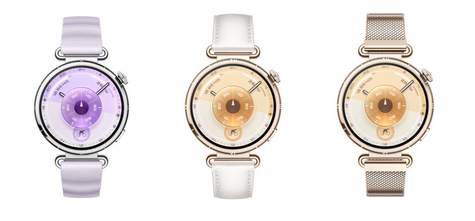 - HUAWEI WATCH GT 6 (รุ่น 41 มม.): แสดงออกถึงความสง่างามที่คล่องตัวในรูปทรงกะทัดรัด มี 3 ตัวเลือกสี: สีม่วง สีขาว และสีทอง มีการออกแบบ ขอบหน้าปัดอักขระใหม่ ที่ใช้ตัวเลขโรมันที่ละเอียดอ่อน และถือเป็นรุ่นแรกที่นำเสนอ หูตัวเรือนแบบหมุนได้ (Pivoting Loop Lugs) ที่ช่วยให้สวมใส่กระชับและเข้ารูปกับข้อมือที่เรียวเล็กได้อย่างยอดเยี่ยม