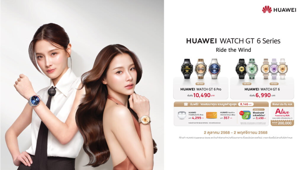 HUAWEI WATCH GT 6 Series พร้อมเป็นผู้ช่วยดูแลสุขภาพแล้ววันนี้ โดย HUAWEI WATCH GT 6 Pro (46 มม.) ราคาเริ่มต้น 10,490 บาท มีให้เลือกทั้งสีดำ สีน้ำตาล และสีไทเทเนียม ส่วน HUAWEI WATCH GT 6 (46 มม.) ราคาเริ่มต้น 6,990 บาท มาพร้อมสีเขียว และสีดำ และ HUAWEI WATCH GT 6 (41 มม.) ราคาเริ่มต้น 6,990 บาท มีให้เลือกในสีม่วง สีขาวสายหนัง และสีทอง Milanese Gold พิเศษ! เมื่อซื้อระหว่าง 2 ตุลาคม 2568 – 2 พฤศจิกายน 2568 รับของสมนาคุณมูลค่ารวมสูงสุด 8,146 บาท อาทิ HUAWEI FreeBuds 6i (สีขาว) มูลค่า 4,299 บาท, HUAWEI Health+ Membership 3 เดือน มูลค่า 357 บาท และฟีเจอร์กอล์ฟระดับพรีเมียม มูลค่า 3,490 บาท (เฉพาะรุ่น HUAWEI WATCH GT 6 Pro เท่านั้น) พร้อมประกันภัย ALive Powered by AIA คุ้มครองชีวิตจากการเจ็บป่วยและอุบัติเหตุ 1 ปี สูงสุด 200,000 บาท