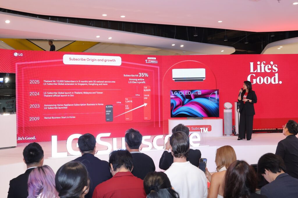บริษัท แอลจี อีเลคทรอนิคส์ (ประเทศไทย) จำกัด จัดงานแถลงข่าวครบรอบหนึ่งปีของ LG Subscribe ในประเทศไทย ฉลองความสำเร็จด้านนวัตกรรมและการสร้างความพึงพอใจให้กับผู้บริโภค ตอกย้ำความเป็นผู้นำในฐานะแบรนด์แรกที่มีบริการแบ่งชำระเครื่องใช้ไฟฟ้าแบบรายเดือน พร้อมการดูแลและรับประกันตลอดอายุสัญญา หรือ Subscription สำหรับเครื่องใช้ไฟฟ้าภายในบ้านในประเทศไทย และเพื่อเป็นการฉลองหมุดหมายแห่งความสำเร็จนี้ แอลจียังเปิดตัว ‘LG Subscribe Friends’ แคมเปญใหม่ที่ร่วมมือกับกลุ่มอินฟลูเอนเซอร์ชื่อดังที่จะพาให้ LG Subscribe เข้าใกล้ผู้บริโภคชาวไทยมากยิ่งขึ้น สะท้อนถึงความมุ่งมั่นของแอลจีในการส่งมอบนวัตกรรมเพื่อชีวิตที่ดียิ่งขึ้นให้แก่ผู้บริโภค สอดคล้องกับปรัชญา “Life’s Good.” ของแอลจี
