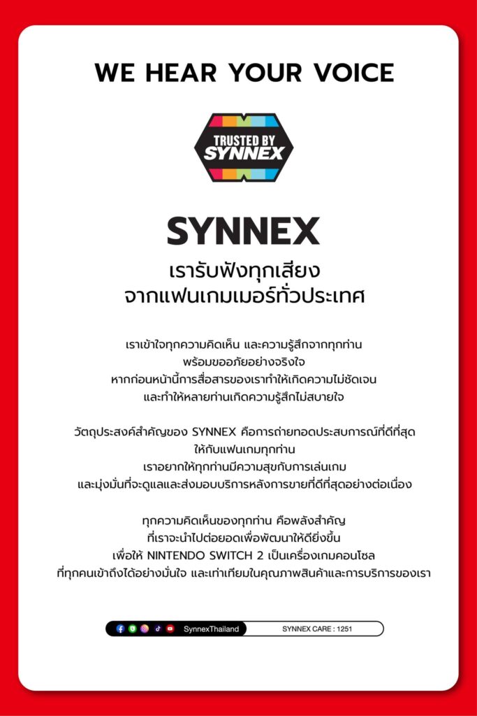 Synnex ยังระบุด้วยว่า “ทุกความคิดเห็นของทุกท่าน คือพลังสำคัญที่เราจะนำไปต่อยอดเพื่อพัฒนาให้ดียิ่งขึ้น เพื่อให้ Nintendo Switch 2 เป็นเครื่องเกมคอนโซลที่ทุกคนเข้าถึงได้อย่างมั่นใจ ทั้งในด้านคุณภาพและบริการหลังการขาย”