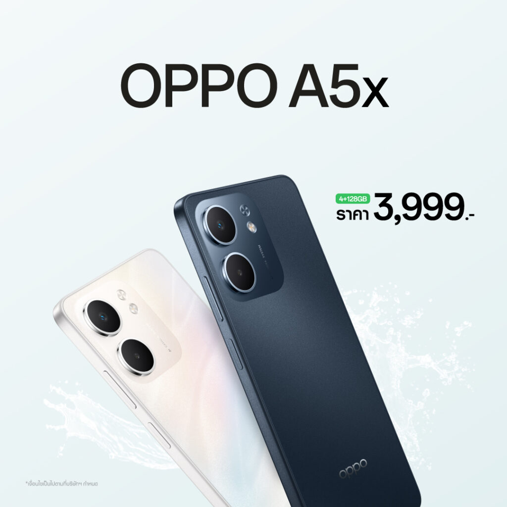 ออปโป้วางจำหน่ายสมาร์ตโฟน OPPO A5 Series พร้อมกัน 2 รุ่น อย่าง OPPO A5x และ OPPO A5i Pro พร้อมเป็นคู่หูความทนทาน สวย ครบ จบทุกดาเมจ OPPO A5x (4+128GB) วางจำหน่ายในราคา 3,999 บาท และ OPPO A5i Pro (8+128GB) วางจำหน่ายในราคาเพียง 5,499 บาท!