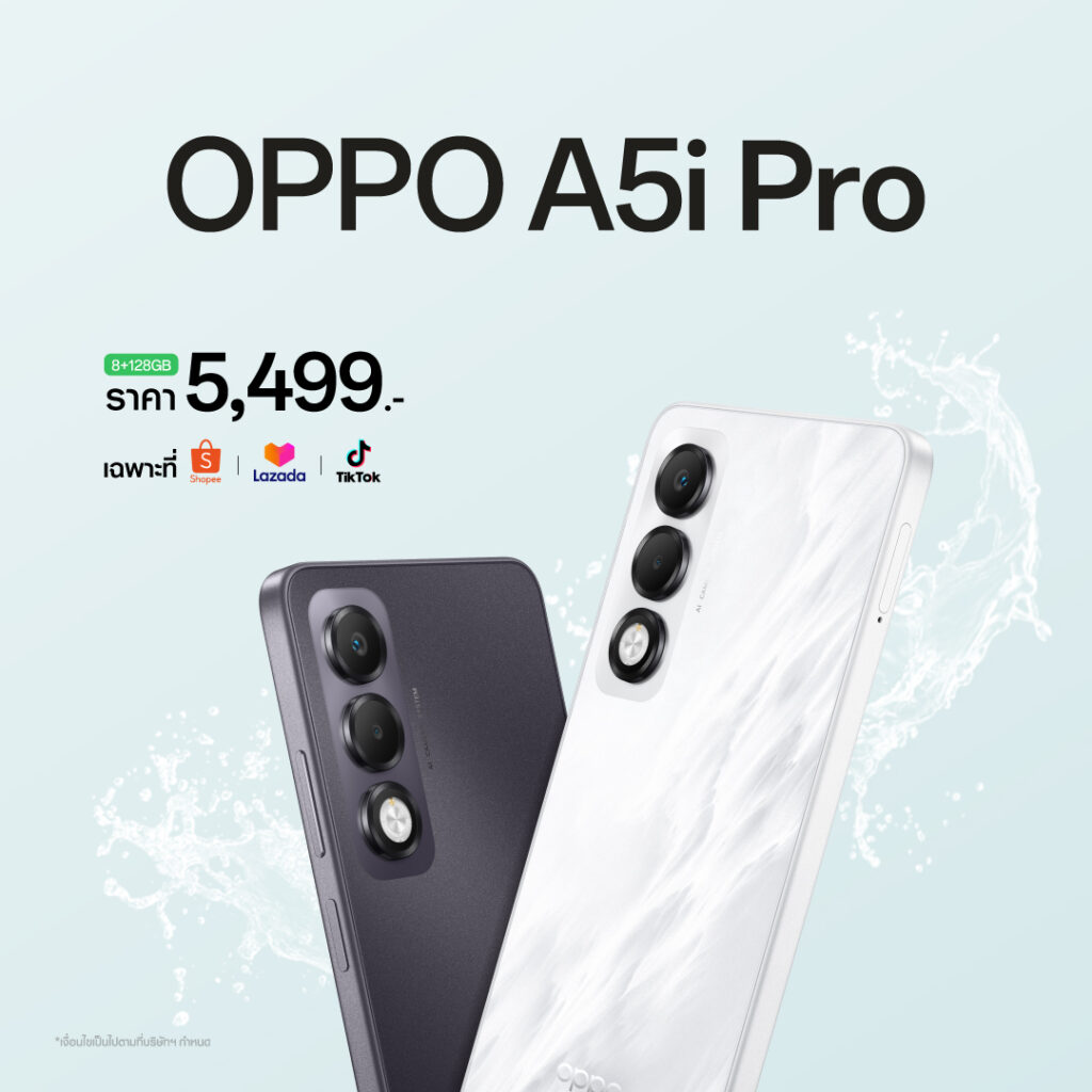โดย OPPO A5i Pro มาพร้อมความจุ 8+128GB และโดดเด่นใน 2 สี ได้แก่ สีขาว Mist White และสีม่วง Midnight Purple วางจำหน่ายในราคา 5,499 บาท ที่ช่องทาง E-Commerce ได้แก่ Shopee, Lazada และ TikTok Shop