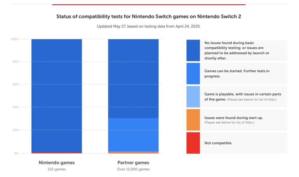 ก่อนหน้านี้ในเดือนเมษายน Nintendo เคยเผยแพร่รายชื่อเกมที่ไม่สามารถใช้งานกับ Switch 2 ได้ และล่าสุดเมื่อวันที่ 27 พฤษภาคมที่ผ่านมา บริษัทได้อัปเดตรายการดังกล่าว โดยยืนยันว่ามีบางเกมที่ได้รับการปรับปรุงให้สามารถทำงานได้เต็มรูปแบบบน Switch 2 หลังจากได้รับการอัปเดต ตัวอย่างเช่น Doom Eternal, Everspace, Batman: The Enemy Within, NBA 2K 25 และ World of Tanks Blitz
