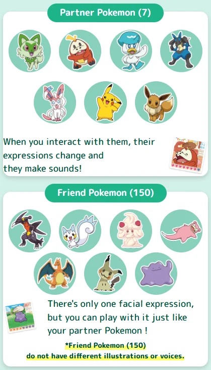 ในอุปกรณ์มีโปเกมอนให้สะสมและสร้างความสัมพันธ์มากถึง 157 ตัว ครอบคลุมโปเกมอนจากทั่วทุกโซน โดยในจำนวนนั้นมี 7 ตัวที่ถูกจัดเป็น “Partner Pokémon” ซึ่งมีเสียงพากย์และแอนิเมชันที่ละเอียดกว่า ได้แก่ Pikachu, Eevee, Sprigatito, Fuecoco, Quaxly, Lucario และ Sylveon