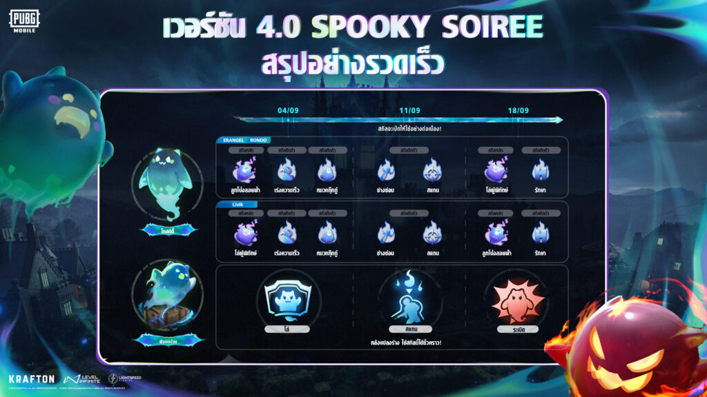 ตั้งแต่วันที่ 4 กันยายน แผนที่ Erangel และ Rondo จะเพิ่ม “Main Skill – Floating Balloon”, “Passive Skill – Boost” และ “Passive Skill – Ghost Helm” ส่วน Livik จะเพิ่ม “Main Skill – Guardian Shield”, “Passive Skill – Boost” และ “Passive Skill – Ghost Helm” ขณะที่ “Prankster Ghost” จะมีสกิล “Shield” ในทั้งสามแผนที่ ต่อมาในวันที่ 11 กันยายน Erangel, Rondo และ Livik จะเพิ่ม “Passive Skill – Armorer” และ “Passive Skill – Scan” และสุดท้ายวันที่ 18 กันยายน Erangel และ Rondo จะเพิ่ม “Main Skill – Guardian Shield” กับ “Passive Skill – Heal” ส่วน Livik จะเพิ่ม “Main Skill – Floating Balloon” กับ “Passive Skill – Heal” ขณะเดียวกัน Prankster Ghost จะได้รับครบทั้งสามสกิล: Bomb, Scan และ Shield ผู้เล่นที่ถูกคัดออกจะเปลี่ยนร่างเป็น Prankster Ghost และยังคงมีผลต่อแมตช์ได้จนกว่าจะโดนความเสียหายหรือพลังงานหมด โดยใช้สกิลเฉพาะตัวอย่าง “Bomb” เพื่อระเบิดใส่และผลักฝั่งตรงข้าม “Scan” เผยตำแหน่งเป้าหมายชั่วคราว และ “Shield” ป้องกันความเสียหาย