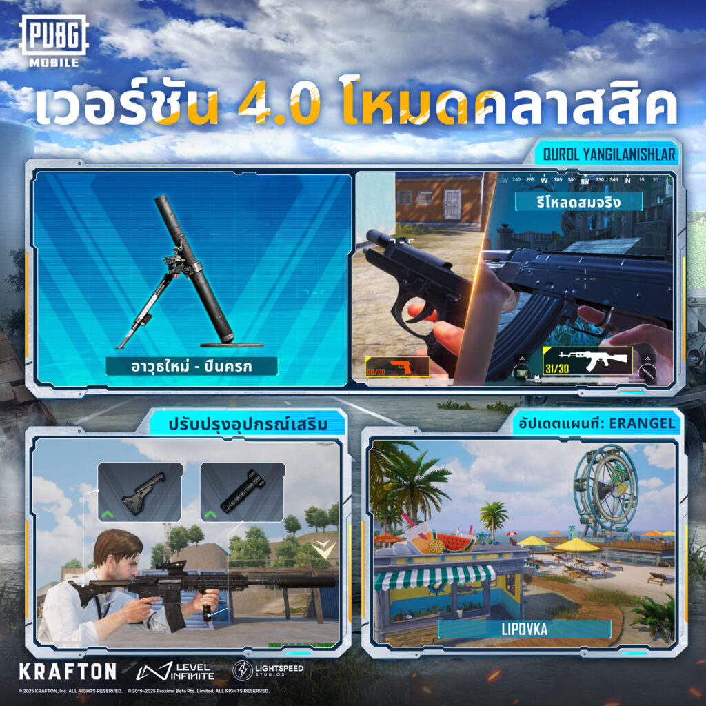โหมด Classic จะได้รับการอัปเดตครั้งใหญ่ทั้งด้านการต่อสู้และความสมจริง อาวุธ “Mortar” ที่เพิ่มเข้ามาจะมอบทางเลือกใหม่ในการโจมตีอย่างทรงพลังทั้งทางตรงและจากระยะไกลตามแผนที่ ระบบ “Realistic Reloading” จะจำลองการรีโหลดเสมือนจริงสำหรับอาวุธหลายชนิด ปรับแอนิเมชันปืนพกให้สมจริงยิ่งขึ้น แถมอาวุธบางแบบจะได้กระสุนเพิ่ม 1 นัดเมื่อรีโหลดเชิงยุทธวิธีเหมือนชีวิตจริง การควบคุมอาวุธนุ่มนวลขึ้นด้วยการปรับปรุงระบบ recoil transmission และในขณะเดียวกันก็ปรับสมดุล “foregrip” และ “stock” ให้เลือกจัดเซ็ตชิ้นส่วนอย่างมีชั้นเชิง ผู้เล่นยังสามารถไปเล่นชิงช้ากับชิงช้าสวรรค์ในสวนริมทะเลของ Lipovka บน Erangel เพื่อพักชิลระหว่างดวลเดือด