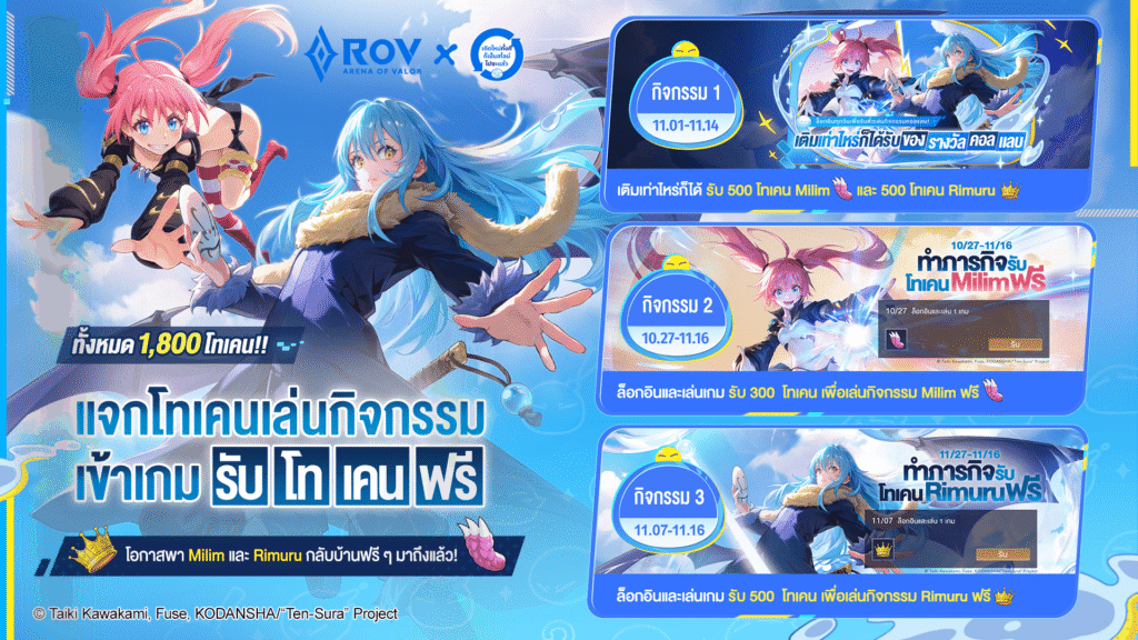 พิเศษสำหรับแฟนเกม RoV เพียงล็อกอินระหว่างช่วงกิจกรรม สามารถรับโทเคนเล่นกิจกรรมสกินคอลแลบ ฟรี เมื่อเติมคูปองครบตามเงื่อนไข รับเพิ่มทันที 1,000 โทเคน สำหรับเล่นกิจกรรม “Milim”และ 800 โทเคน สำหรับกิจกรรม “Rimuru” รีบเข้าเกมตอนนี้ แล้วคว้าสกินทั้งหมดมาครอบครองได้เลย!