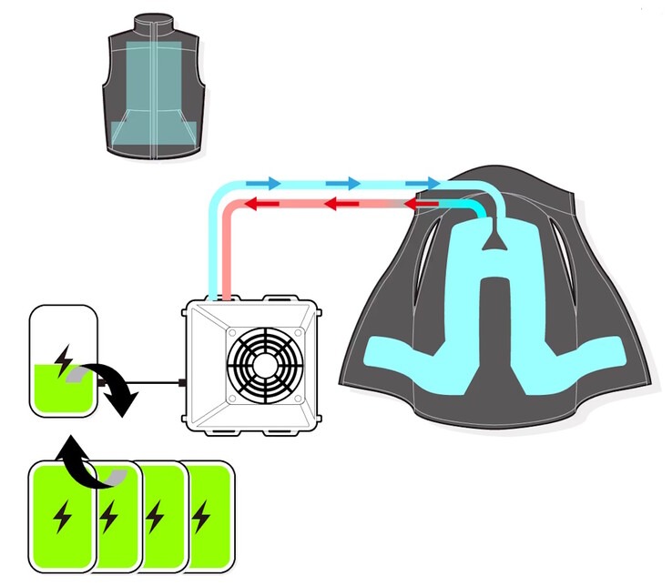 เสื้อกั๊ก ChillerX ใช้น้ำเป็นตัวกลางในการระบายความร้อน โดยจะส่งน้ำให้หมุนเวียนทั่วตัวเสื้อเพื่อดึงความร้อนส่วนเกินออกจากร่างกาย น้ำจะไหลผ่านชุดทำความเย็นแบบ Peltier ที่ติดตั้งอยู่ด้านหลังเสื้อกั๊ก ซึ่งจะช่วยถ่ายเทความร้อนออกสู่ภายนอก และทำให้น้ำเย็นลงต่ำกว่าอุณหภูมิอากาศโดยรอบได้ถึง 35 องศาเซลเซียส ตามที่บริษัทระบุไว้