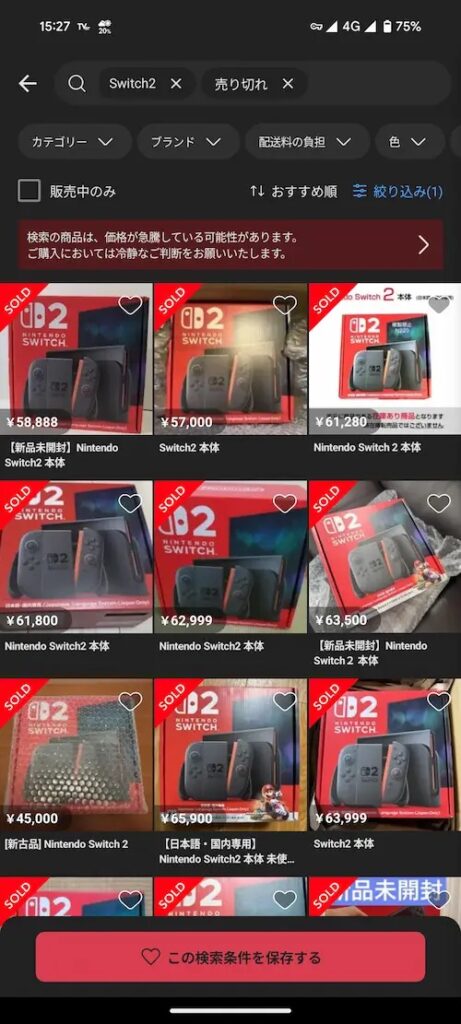 จากประกาศขายบนเว็บไซต์ Mercari ของญี่ปุ่นพบว่าเครื่อง Switch 2 เวอร์ชันภาษาญี่ปุ่น (ที่ขายเฉพาะในญี่ปุ่น) บางเครื่องถูกขายต่ำกว่า 60,000 เยน (ประมาณ 13,200 บาท) โดยบางรายการขายที่ราคาเพียง 57,000 เยน (ประมาณ 12,600 บาท) ซึ่งเมื่อนำต้นทุนรวมค่าธรรมเนียมแพลตฟอร์ม ค่าขนส่ง และราคาขายปลีกของเครื่อง มาคำนวณรวมกันแล้ว พ่อค้ารีเซลรายนั้นขาดทุนไปราว 10 เยน (ประมาณ 2.23 บาท)