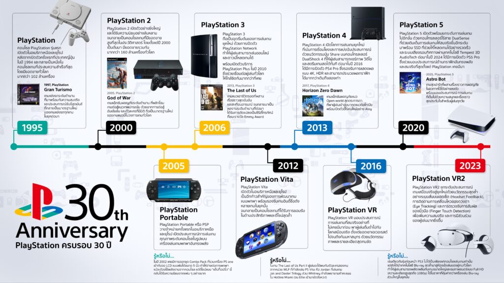 ทางโซนี่ยังได้จัดทำอินโฟกราฟิกพิเศษ เพื่อฉลองครบรอบ 30 ปีของ PlayStation โดยรวบรวมช่วงเวลาสำคัญตลอด 3 ทศวรรษของแพลตฟอร์มที่กลายเป็นที่รักของแฟน ๆ ทั่วโลก