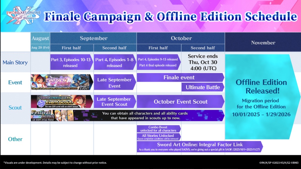 Bandai Namco ประกาศเตรียมปิดให้บริการเกมมือถือ Sword Art Online Variant Showdown อย่างเป็นทางการในวันที่ 30 ตุลาคม 2025 โดยได้หยุดให้บริการซื้อไอเทมและเติมเงินในเกมตั้งแต่วันที่ 29 สิงหาคมที่ผ่านมา อย่างไรก็ตาม เกมจะเปิดตัวเวอร์ชัน Offline Edition ให้เล่นต่อได้ในวันเดียวกับที่เซิร์ฟเวอร์หลักปิดตัว