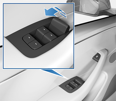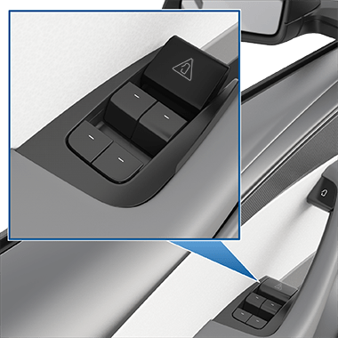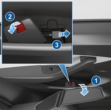 - ประตูหน้า หากต้องการเปิดประตูหน้าในสถานการณ์ที่ไม่มีไฟฟ้า ให้ดึงที่ปลดล็อกประตูบริเวณหน้าสวิตช์กระจกขึ้นมาดังภาพ