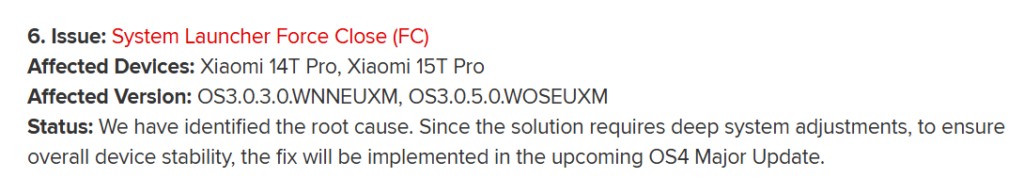 การอัปเกรด HyperOS ครั้งใหญ่ครั้งถัดไปถูกระบุไว้ในหัวข้อปัญหาที่ 6 ของรายงานบั๊กรายสัปดาห์ฉบับล่าสุด ซึ่งเป็นประเด็นเกี่ยวกับปัญหา System Launcher ปิดตัวเอง โดยในสถานะของปัญหาระบุว่า “การแก้ไขจะถูกนำไปใช้ในอัปเดต OS4 Major Update ที่กำลังจะมาถึง” ซึ่งในที่นี้ OS4 หมายถึง HyperOS 4